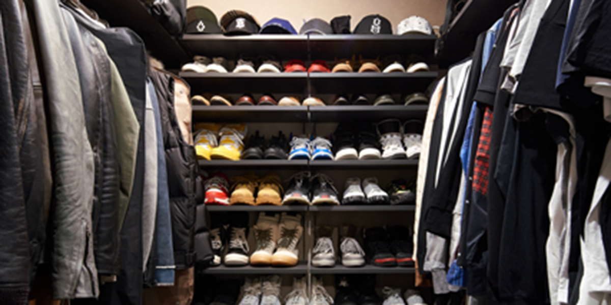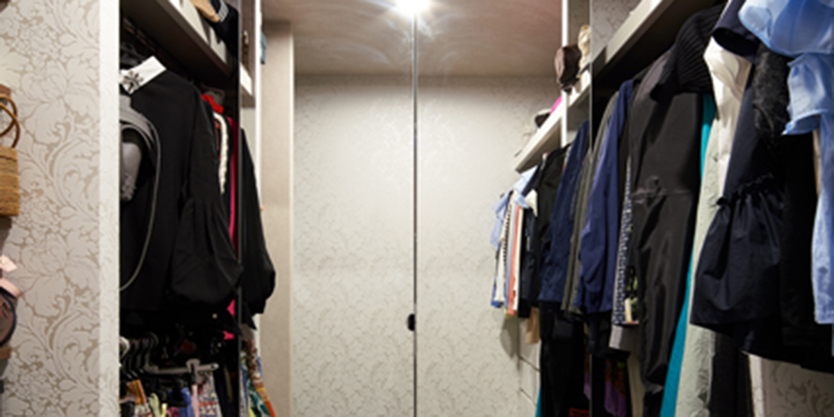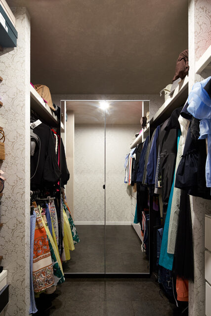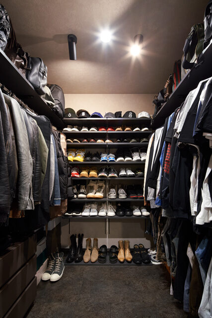 とてもスタイリッシュでおしゃれなご夫婦ですので、お洋服も靴もたくさん持っておられます。特にご主人は、お気に入りの靴が映えるように、壁紙や収納棚の色にもこだわられました。