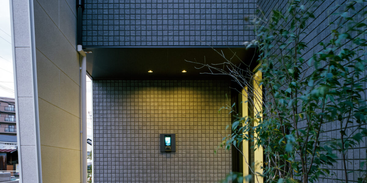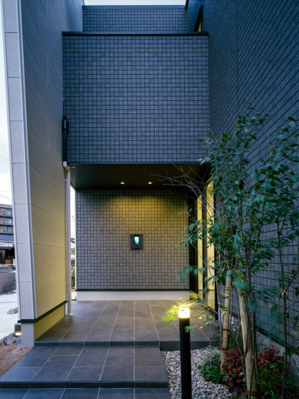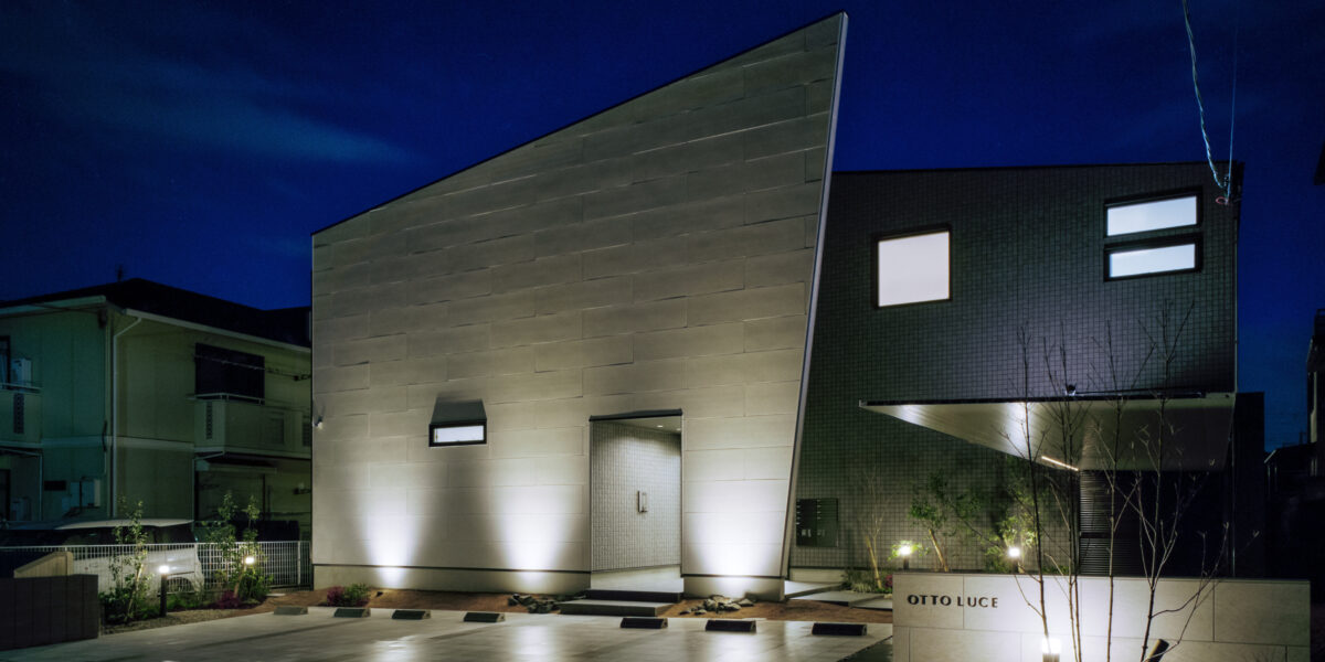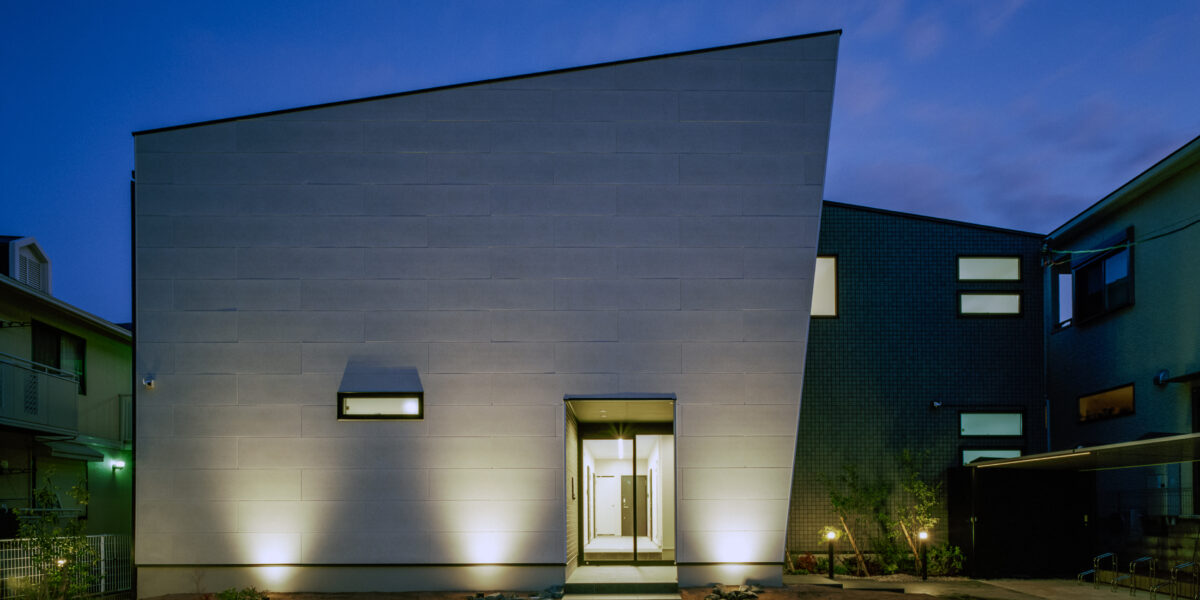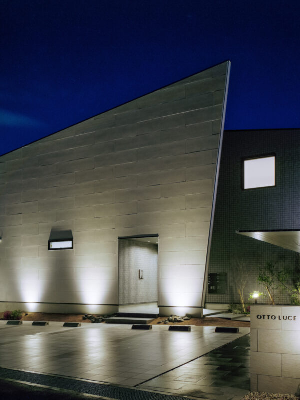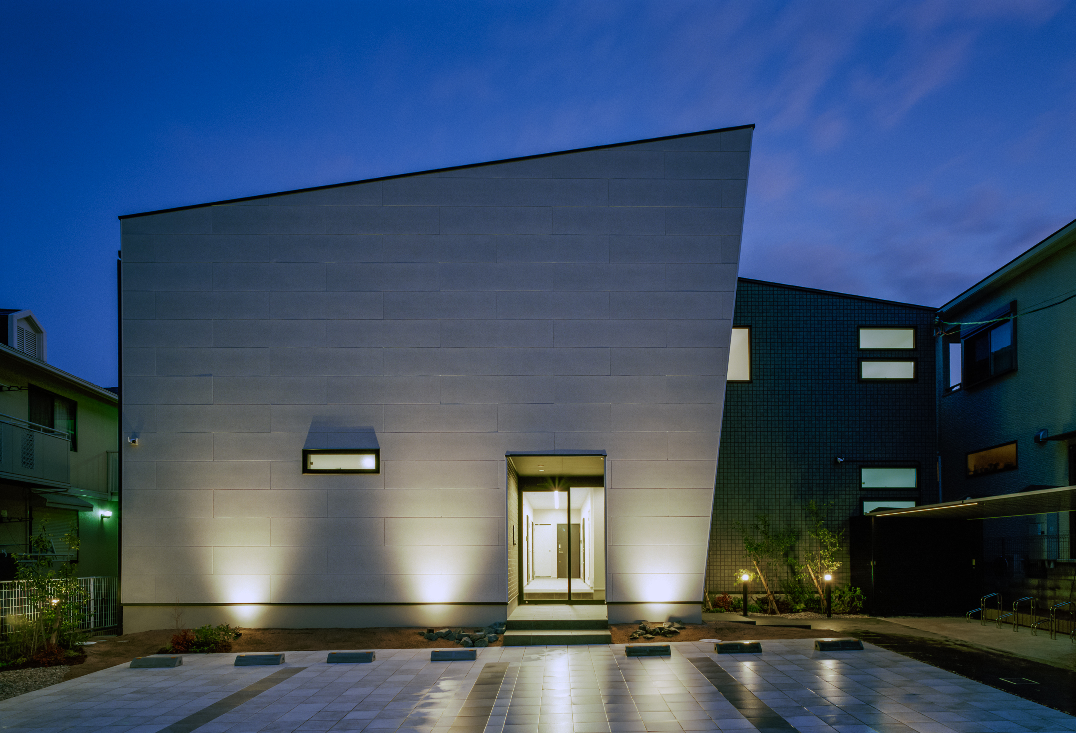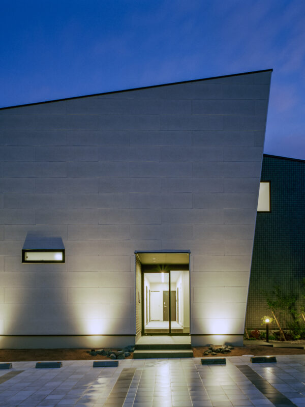 黒を基調とした外壁に、象徴的な白い斜め壁をアクセントとして配した外観は、日中はシャープに、夜間はライトアップによって店舗のような洗練された佇まいになっています。