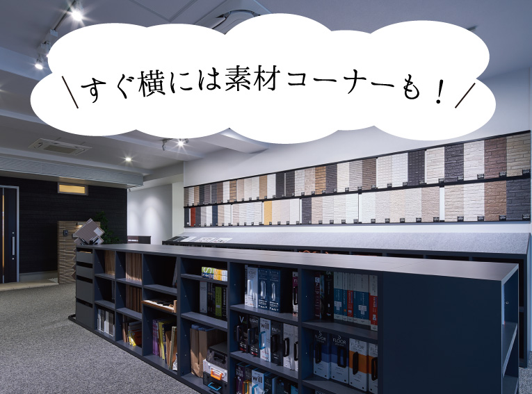 3階サンプルコーナーには床材や外壁素材がずらり!気になっていた素材を実際に触って確かめることができます。