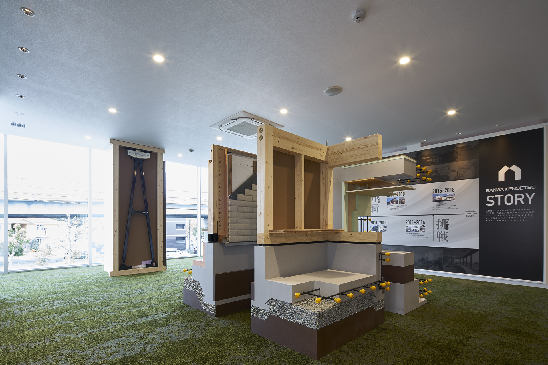 3階には実物大モデルハウスをご用意しています。屋内にあるメリットを生かし、あえて壁の一部を取り払うことで室内に入らずとも間取りやサイズ感を俯瞰してみることができます。